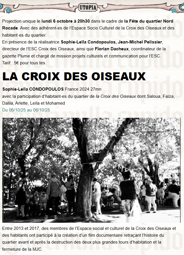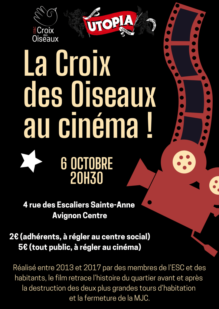 Lundi 6 octobre à 20h30, nous vous donnons rendez-vous au Cinéma Utopia pour découvrir le film documentaire dédié à l’histoire du Quartier de la Croix des Oiseaux et réalisé par les habitants. L’occasion aussi pour toute l’équipe du centre, ses bénévoles et ses adhérents de témoigner du présent et des actions menées.