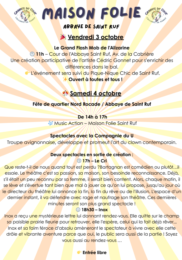 Vendredi 3 octobre, après une déambulation depuis l’Institut l’Alizarine à partir de 9h45, qui passera par la Maison Folie, un grand Flash Mob sera organisé à 11h et sera suivi par un pique-nique tiré du sac au Parc de l’Abbaye de Saint-Ruf. Le soir, un ciné-concert organisé par l’association Dans la Place débutera à 20h, square de la 1ère Armée Française Rhin et Danube.