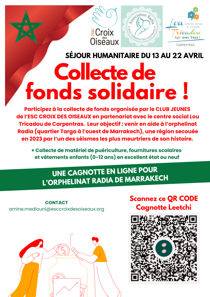 Notre groupe s’apprête à vivre une expérience inoubliable en partant pour le Maroc du 13 au 22 avril dans le cadre d’un projet humanitaire profondément engagé, en partenariat avec le centre social Lou Tricadou (Carpentras). Cette initiative nous mènera jusqu’à l’orphelinat Radia (quartier Targa à l’ouest de Marrakech), où nous aurons l’honneur d’apporter notre soutien aux enfants qui y résident.