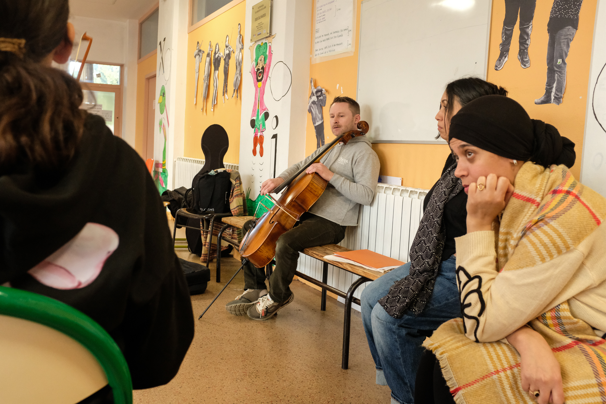 D’octobre 2024 à janvier 2026, je suis allé à la rencontre de l’équipe sociale de Démos Avignon pour comprendre comment elle participe au projet et intervient auprès des familles et des enfants. Après avoir fait des entretiens avec Bouchra, Rajae (Croix des Oiseaux), Emilie, Lucie, Driss, Mathias, Olivia et Isabelle, j’ai également échangé avec vingt parents dont les enfants participent à Démos depuis 2021. A l’échelle nationale, les référents sociaux sont souvent le ciment de Démos. En majorité des femmes, elles viennent d’horizons différents : centre social et/ou culturel, éducation nationale, associations. Démos est une mission au sein de leur profession qui recouvre d’autres activités de médiation, d’animation ou d’enseignement. Près de 64% des référents sociaux ayant répondu à notre questionnaire apprennent à jouer d’un instrument dans Démos, en même temps que les enfants. C’est le cas à Avignon, où l’entraide entre enfants et adultes est de mise. Les référentes sociales interviennent aussi sur la gestion des émotions et les soucis du quotidien. Elles ont une connaissance solide de leur territoire, de par leur ancienneté et leur autorité dans leur quartier respectif de la rocade Sud-Est. Et les familles leur font d’autant plus confiance. Via WhatsApp et des temps de rencontre, ces dernières suivent le projet ou sont invitées à participer au Chœur des Familles. Notre étude s’intéresse alors plus finement à la relation “référent social-famille”. Pour des conclusions plus précises, notre rapport complet sera livré à l’été 2026.
