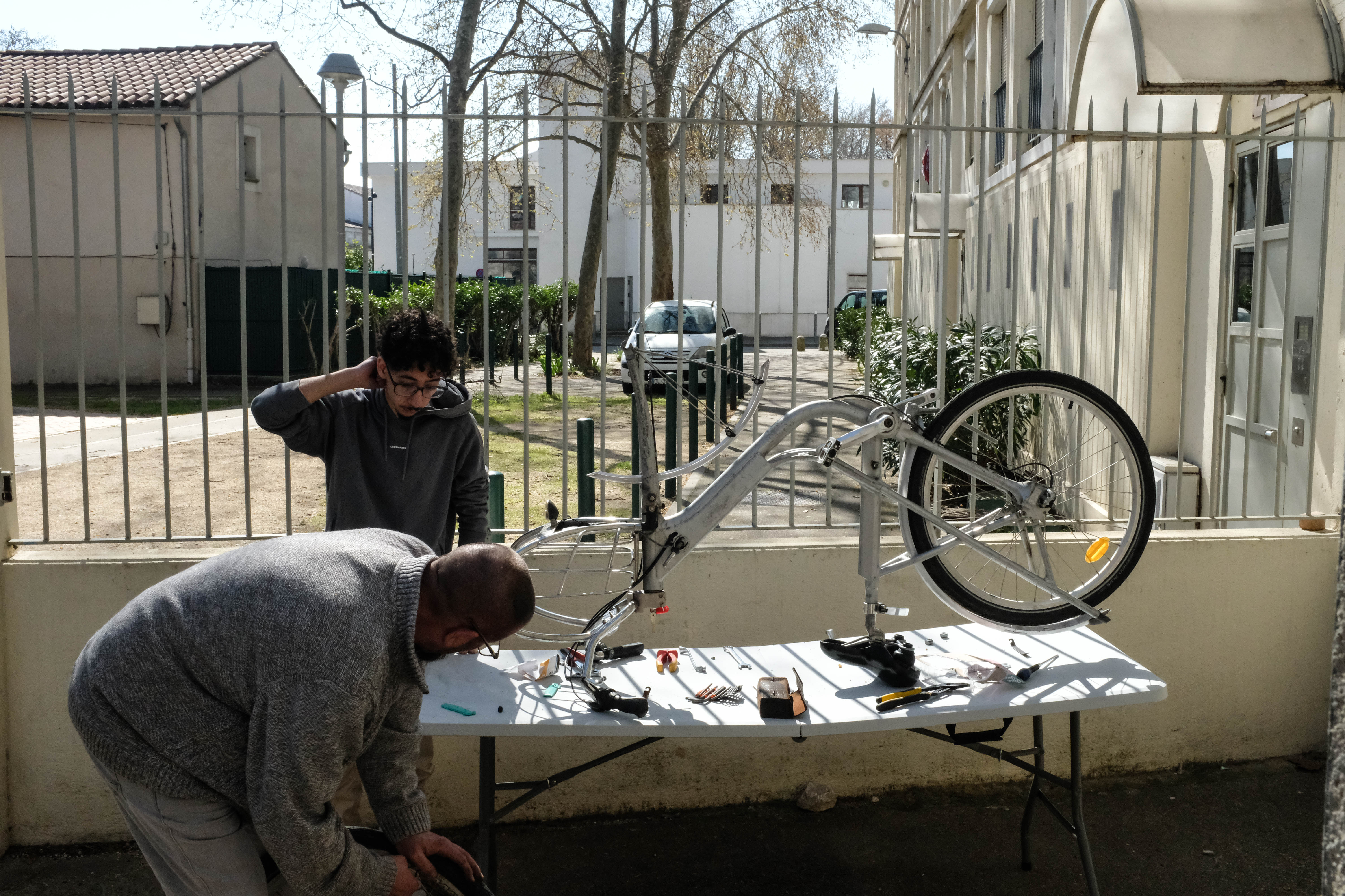 En amont de ces séances, notre bénévole Rudy et notre service civique Abdelrahim ont sorti les outils pour remettre d’aplomb de vieux Vélopop légués par la ville.