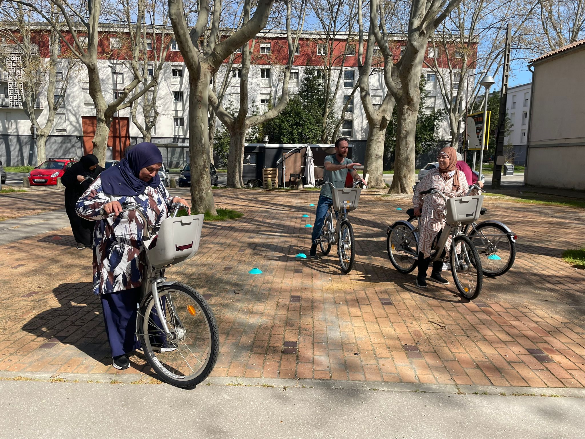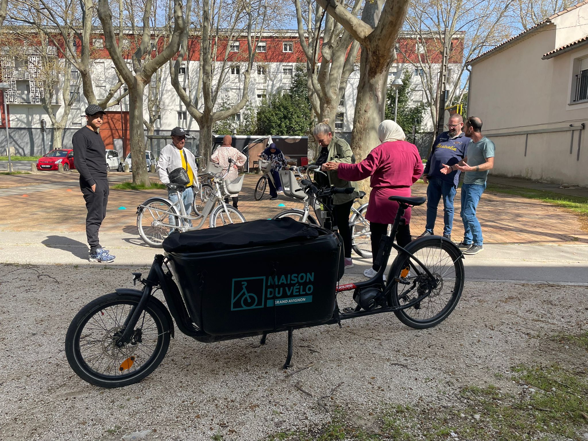 Réunies sur la place de L’Escale, les participantes écoutent avec attention les conseils de Pierre-Alain Le Gac, chargé d’animation pour la Maison du Vélo du Grand Avignon.